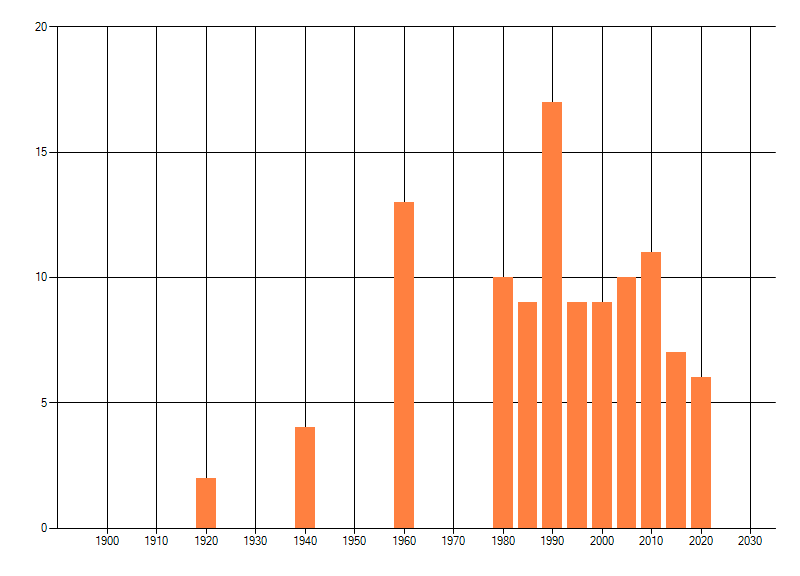 Het aantal atlasblokken (5x5 km) waarin de soort is gemeld binnen een periode van vijf jaar (vanaf 1980) of twintig jaar. Niet gecorrigeerd voor waarnemersinspanning en het aantal doorgegeven waarnemingen kan sterk variëren per periode, dus een trend in verspreiding kan hier niet direct uit worden afgelezen. Het opgegeven jaartal is het eerste jaar van de periode. Bron: gevalideerde waarnemingen uit de NDFF.