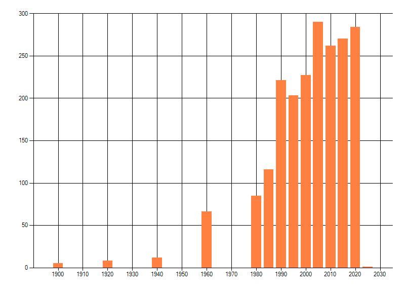 Het aantal atlasblokken (5x5 km) waarin de soort is gemeld binnen een periode van vijf jaar (vanaf 1980) of twintig jaar. Niet gecorrigeerd voor waarnemersinspanning en het aantal doorgegeven waarnemingen kan sterk variëren per periode, dus een trend in verspreiding kan hier niet direct uit worden afgelezen. Het opgegeven jaartal is het eerste jaar van de periode. Bron: gevalideerde waarnemingen uit de NDFF.