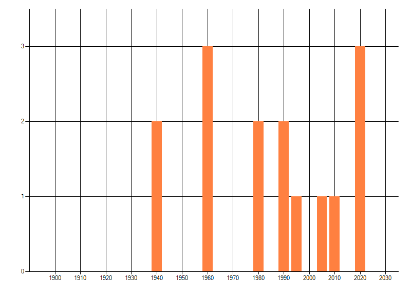 Het aantal atlasblokken (5x5 km) waarin de soort is gemeld binnen een periode van vijf jaar (vanaf 1980) of twintig jaar. Niet gecorrigeerd voor waarnemersinspanning en het aantal doorgegeven waarnemingen kan sterk variëren per periode, dus een trend in verspreiding kan hier niet direct uit worden afgelezen. Het opgegeven jaartal is het eerste jaar van de periode. Bron: gevalideerde waarnemingen uit de NDFF.