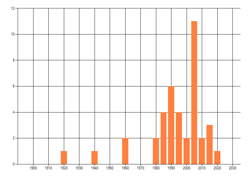 Het aantal atlasblokken (5x5 km) waarin de soort is gemeld binnen een periode van vijf jaar (vanaf 1980) of twintig jaar. Niet gecorrigeerd voor waarnemersinspanning en het aantal doorgegeven waarnemingen kan sterk variëren per periode, dus een trend in verspreiding kan hier niet direct uit worden afgelezen. Het opgegeven jaartal is het eerste jaar van de periode. Bron: gevalideerde waarnemingen uit de NDFF.
