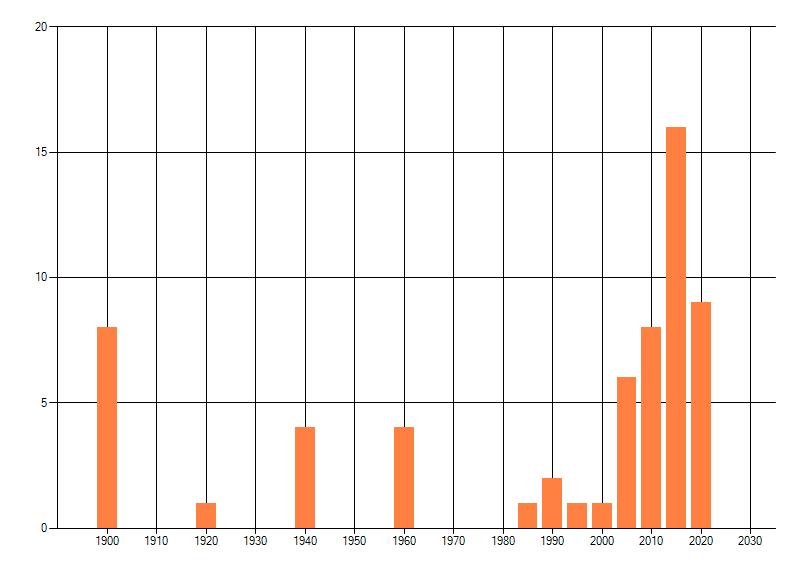 Het aantal atlasblokken (5x5 km) waarin de soort is gemeld binnen een periode van vijf jaar (vanaf 1980) of twintig jaar. Niet gecorrigeerd voor waarnemersinspanning en het aantal doorgegeven waarnemingen kan sterk variëren per periode, dus een trend in verspreiding kan hier niet direct uit worden afgelezen. Het opgegeven jaartal is het eerste jaar van de periode. Bron: gevalideerde waarnemingen uit de NDFF.