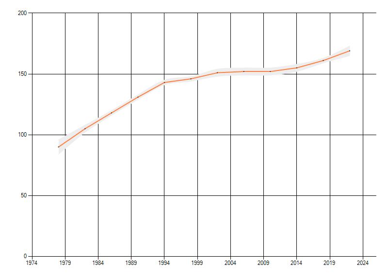 Gemiddelde trend van het aantal kilometerhokken waarin de soort voorkomt, weergegeven als indexcijfer (1975-1978 = 100). De trend is gecorrigeerd voor waarnemersinspanning en geeft de relatieve verandering in het aantal bezette kilometerhokken weer. Voor de berekening worden de data per periode van vier jaar samengenomen. In de grafiek correspondeert ieder punt met het laatste jaar van zo'n periode.