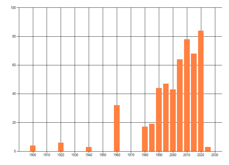 Het aantal atlasblokken (5x5 km) waarin de soort is gemeld binnen een periode van vijf jaar (vanaf 1980) of twintig jaar. Niet gecorrigeerd voor waarnemersinspanning en het aantal doorgegeven waarnemingen kan sterk variëren per periode, dus een trend in verspreiding kan hier niet direct uit worden afgelezen. Het opgegeven jaartal is het eerste jaar van de periode. Bron: gevalideerde waarnemingen uit de NDFF.