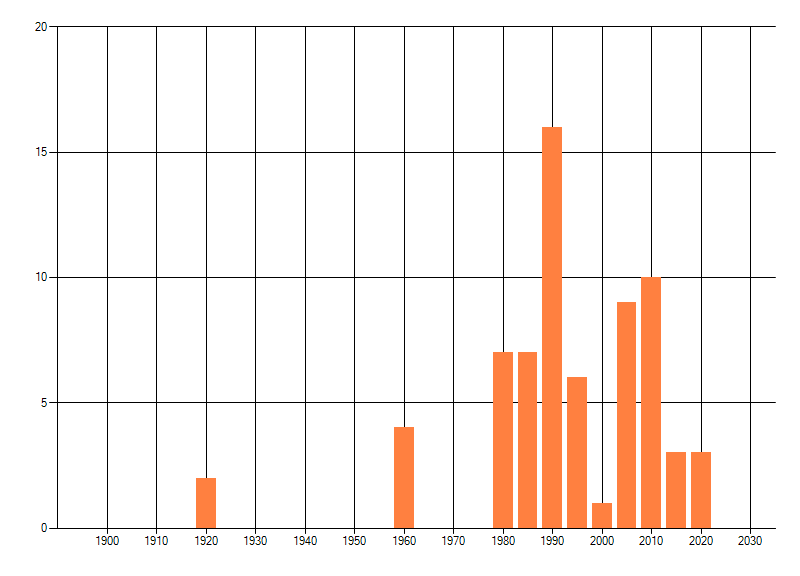 Het aantal atlasblokken (5x5 km) waarin de soort is gemeld binnen een periode van vijf jaar (vanaf 1980) of twintig jaar. Niet gecorrigeerd voor waarnemersinspanning en het aantal doorgegeven waarnemingen kan sterk variëren per periode, dus een trend in verspreiding kan hier niet direct uit worden afgelezen. Het opgegeven jaartal is het eerste jaar van de periode. Bron: gevalideerde waarnemingen uit de NDFF.