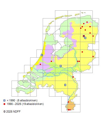 Het aantal atlasblokken (5x5 km) waarin de soort is gemeld binnen een periode van vijf jaar (vanaf 1980) of twintig jaar. Niet gecorrigeerd voor waarnemersinspanning en het aantal doorgegeven waarnemingen kan sterk variëren per periode, dus een trend in verspreiding kan hier niet direct uit worden afgelezen. Het opgegeven jaartal is het eerste jaar van de periode. Bron: gevalideerde waarnemingen uit de NDFF.