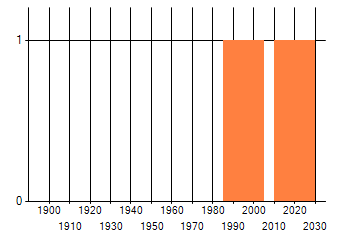 Het aantal atlasblokken (5x5 km) waarin de soort is gemeld binnen een periode van vijf jaar (vanaf 1980) of twintig jaar. Niet gecorrigeerd voor waarnemersinspanning en het aantal doorgegeven waarnemingen kan sterk variëren per periode, dus een trend in verspreiding kan hier niet direct uit worden afgelezen. Het opgegeven jaartal is het eerste jaar van de periode. Bron: gevalideerde waarnemingen uit de NDFF.