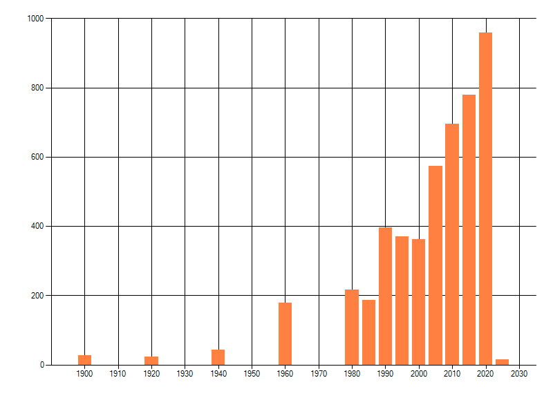 Het aantal atlasblokken (5x5 km) waarin de soort is gemeld binnen een periode van vijf jaar (vanaf 1980) of twintig jaar. Niet gecorrigeerd voor waarnemersinspanning en het aantal doorgegeven waarnemingen kan sterk variëren per periode, dus een trend in verspreiding kan hier niet direct uit worden afgelezen. Het opgegeven jaartal is het eerste jaar van de periode. Bron: gevalideerde waarnemingen uit de NDFF.