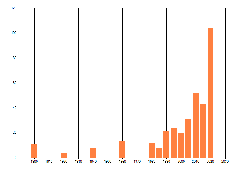 Het aantal atlasblokken (5x5 km) waarin de soort is gemeld binnen een periode van vijf jaar (vanaf 1980) of twintig jaar. Niet gecorrigeerd voor waarnemersinspanning en het aantal doorgegeven waarnemingen kan sterk variëren per periode, dus een trend in verspreiding kan hier niet direct uit worden afgelezen. Het opgegeven jaartal is het eerste jaar van de periode. Bron: gevalideerde waarnemingen uit de NDFF.