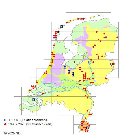 Het aantal atlasblokken (5x5 km) waarin de soort is gemeld binnen een periode van vijf jaar (vanaf 1980) of twintig jaar. Niet gecorrigeerd voor waarnemersinspanning en het aantal doorgegeven waarnemingen kan sterk variëren per periode, dus een trend in verspreiding kan hier niet direct uit worden afgelezen. Het opgegeven jaartal is het eerste jaar van de periode. Bron: gevalideerde waarnemingen uit de NDFF.