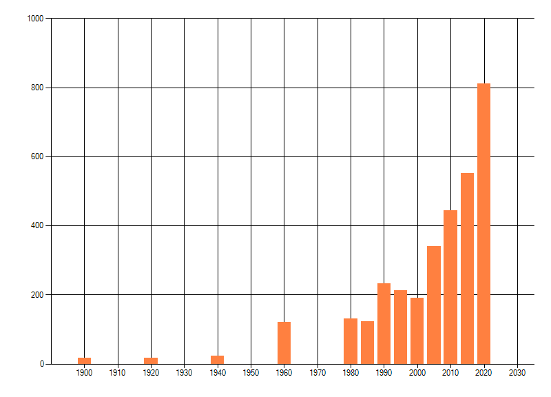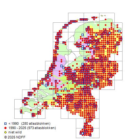 Het aantal atlasblokken (5x5 km) waarin de soort is gemeld binnen een periode van vijf jaar (vanaf 1980) of twintig jaar. Niet gecorrigeerd voor waarnemersinspanning en het aantal doorgegeven waarnemingen kan sterk variëren per periode, dus een trend in verspreiding kan hier niet direct uit worden afgelezen. Het opgegeven jaartal is het eerste jaar van de periode. Bron: gevalideerde waarnemingen uit de NDFF.
