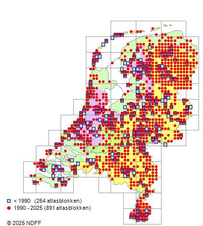 Het aantal atlasblokken (5x5 km) waarin de soort is gemeld binnen een periode van vijf jaar (vanaf 1980) of twintig jaar. Niet gecorrigeerd voor waarnemersinspanning en het aantal doorgegeven waarnemingen kan sterk variëren per periode, dus een trend in verspreiding kan hier niet direct uit worden afgelezen. Het opgegeven jaartal is het eerste jaar van de periode. Bron: gevalideerde waarnemingen uit de NDFF.