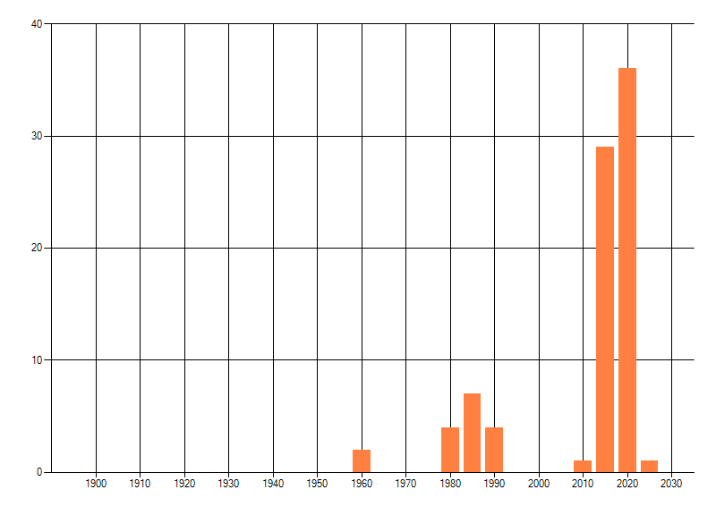 Het aantal atlasblokken (5x5 km) waarin de soort is gemeld binnen een periode van vijf jaar (vanaf 1980) of twintig jaar. Niet gecorrigeerd voor waarnemersinspanning en het aantal doorgegeven waarnemingen kan sterk variëren per periode, dus een trend in verspreiding kan hier niet direct uit worden afgelezen. Het opgegeven jaartal is het eerste jaar van de periode. Bron: gevalideerde waarnemingen uit de NDFF.