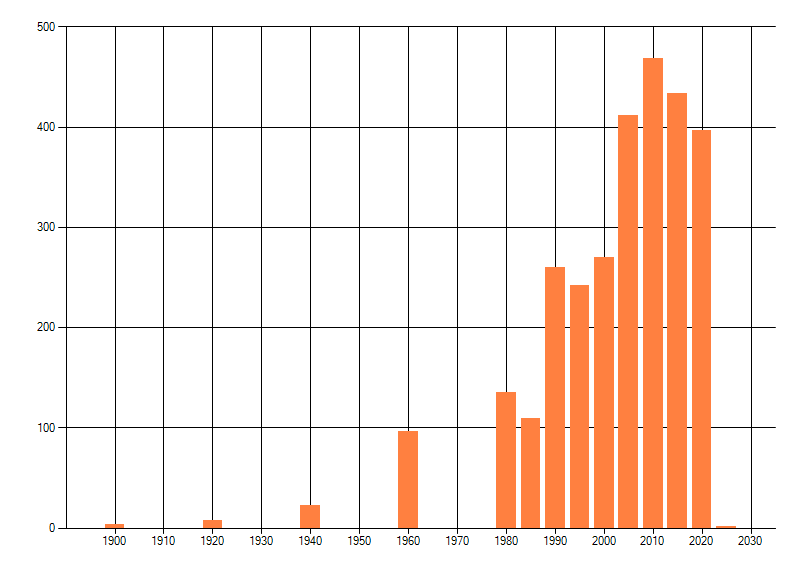 Het aantal atlasblokken (5x5 km) waarin de soort is gemeld binnen een periode van vijf jaar (vanaf 1980) of twintig jaar. Niet gecorrigeerd voor waarnemersinspanning en het aantal doorgegeven waarnemingen kan sterk variëren per periode, dus een trend in verspreiding kan hier niet direct uit worden afgelezen. Het opgegeven jaartal is het eerste jaar van de periode. Bron: gevalideerde waarnemingen uit de NDFF.