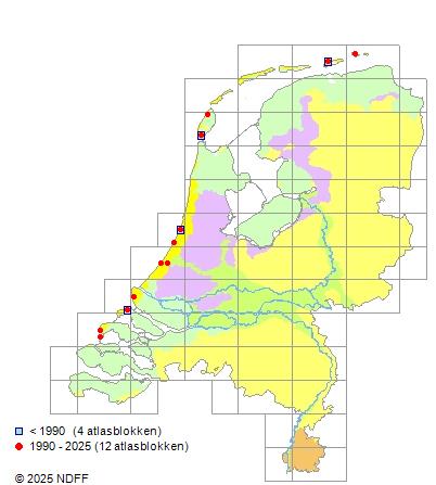 Zeer zeld., in R en W (Schiermonnikoog, Oosterkwelder; Texel, De Mok; Zandvoort; Goedereede, Kwade Hoek). Kaart in Nauta & Vellinga, Atlas. 1995.