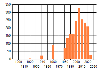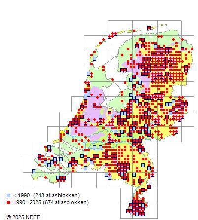 Het aantal atlasblokken (5x5 km) waarin de soort is gemeld binnen een periode van vijf jaar (vanaf 1980) of twintig jaar. Niet gecorrigeerd voor waarnemersinspanning en het aantal doorgegeven waarnemingen kan sterk variëren per periode, dus een trend in verspreiding kan hier niet direct uit worden afgelezen. Het opgegeven jaartal is het eerste jaar van de periode. Bron: gevalideerde waarnemingen uit de NDFF.