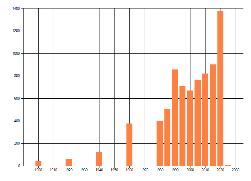 Het aantal atlasblokken (5x5 km) waarin de soort is gemeld binnen een periode van vijf jaar (vanaf 1980) of twintig jaar. Niet gecorrigeerd voor waarnemersinspanning en het aantal doorgegeven waarnemingen kan sterk variëren per periode, dus een trend in verspreiding kan hier niet direct uit worden afgelezen. Het opgegeven jaartal is het eerste jaar van de periode. Bron: gevalideerde waarnemingen uit de NDFF.