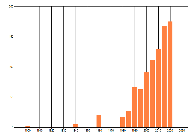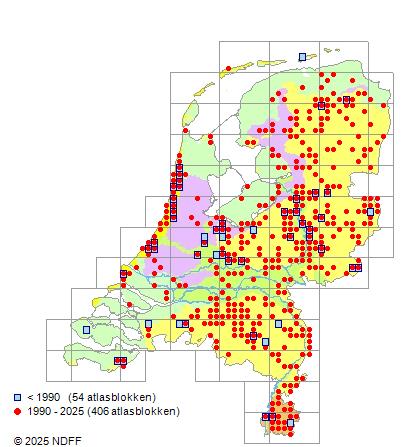 Het aantal atlasblokken (5x5 km) waarin de soort is gemeld binnen een periode van vijf jaar (vanaf 1980) of twintig jaar. Niet gecorrigeerd voor waarnemersinspanning en het aantal doorgegeven waarnemingen kan sterk variëren per periode, dus een trend in verspreiding kan hier niet direct uit worden afgelezen. Het opgegeven jaartal is het eerste jaar van de periode. Bron: gevalideerde waarnemingen uit de NDFF.