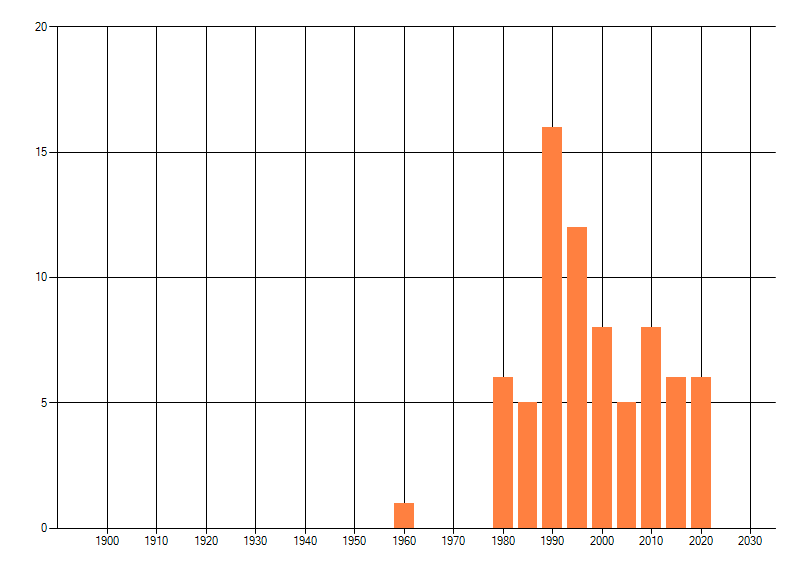 Het aantal atlasblokken (5x5 km) waarin de soort is gemeld binnen een periode van vijf jaar (vanaf 1980) of twintig jaar. Niet gecorrigeerd voor waarnemersinspanning en het aantal doorgegeven waarnemingen kan sterk variëren per periode, dus een trend in verspreiding kan hier niet direct uit worden afgelezen. Het opgegeven jaartal is het eerste jaar van de periode. Bron: gevalideerde waarnemingen uit de NDFF.