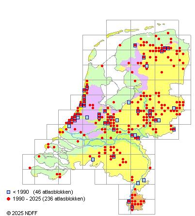 Het aantal atlasblokken (5x5 km) waarin de soort is gemeld binnen een periode van vijf jaar (vanaf 1980) of twintig jaar. Niet gecorrigeerd voor waarnemersinspanning en het aantal doorgegeven waarnemingen kan sterk variëren per periode, dus een trend in verspreiding kan hier niet direct uit worden afgelezen. Het opgegeven jaartal is het eerste jaar van de periode. Bron: gevalideerde waarnemingen uit de NDFF.