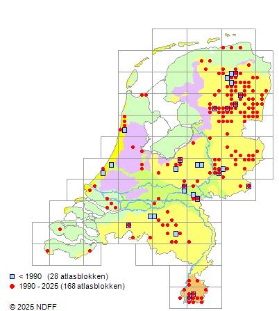 Het aantal atlasblokken (5x5 km) waarin de soort is gemeld binnen een periode van vijf jaar (vanaf 1980) of twintig jaar. Niet gecorrigeerd voor waarnemersinspanning en het aantal doorgegeven waarnemingen kan sterk variëren per periode, dus een trend in verspreiding kan hier niet direct uit worden afgelezen. Het opgegeven jaartal is het eerste jaar van de periode. Bron: gevalideerde waarnemingen uit de NDFF.