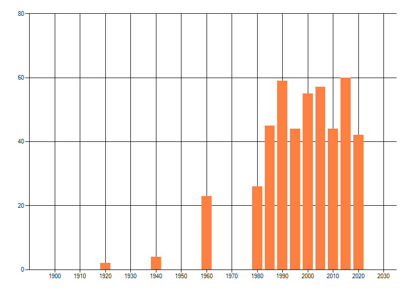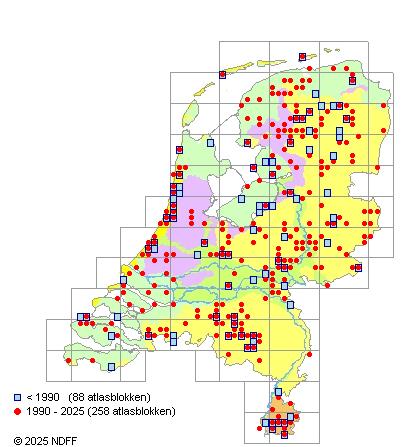 Het aantal atlasblokken (5x5 km) waarin de soort is gemeld binnen een periode van vijf jaar (vanaf 1980) of twintig jaar. Niet gecorrigeerd voor waarnemersinspanning en het aantal doorgegeven waarnemingen kan sterk variëren per periode, dus een trend in verspreiding kan hier niet direct uit worden afgelezen. Het opgegeven jaartal is het eerste jaar van de periode. Bron: gevalideerde waarnemingen uit de NDFF.