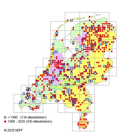 Het aantal atlasblokken (5x5 km) waarin de soort is gemeld binnen een periode van vijf jaar (vanaf 1980) of twintig jaar. Niet gecorrigeerd voor waarnemersinspanning en het aantal doorgegeven waarnemingen kan sterk variëren per periode, dus een trend in verspreiding kan hier niet direct uit worden afgelezen. Het opgegeven jaartal is het eerste jaar van de periode. Bron: gevalideerde waarnemingen uit de NDFF.