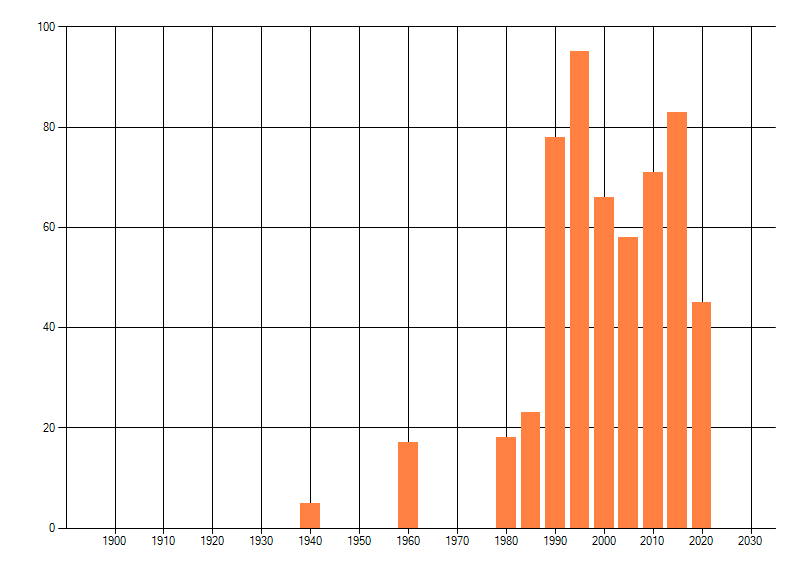 Het aantal atlasblokken (5x5 km) waarin de soort is gemeld binnen een periode van vijf jaar (vanaf 1980) of twintig jaar. Niet gecorrigeerd voor waarnemersinspanning en het aantal doorgegeven waarnemingen kan sterk variëren per periode, dus een trend in verspreiding kan hier niet direct uit worden afgelezen. Het opgegeven jaartal is het eerste jaar van de periode. Bron: gevalideerde waarnemingen uit de NDFF.