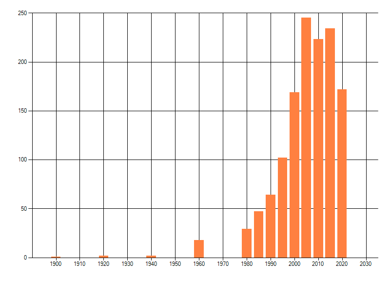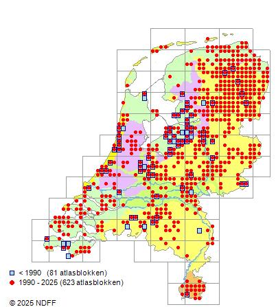 Het aantal atlasblokken (5x5 km) waarin de soort is gemeld binnen een periode van vijf jaar (vanaf 1980) of twintig jaar. Niet gecorrigeerd voor waarnemersinspanning en het aantal doorgegeven waarnemingen kan sterk variëren per periode, dus een trend in verspreiding kan hier niet direct uit worden afgelezen. Het opgegeven jaartal is het eerste jaar van de periode. Bron: gevalideerde waarnemingen uit de NDFF.