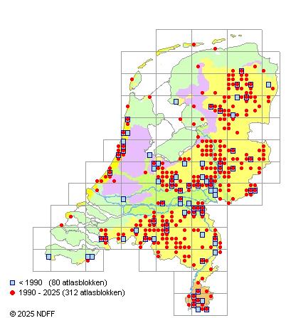 Het aantal atlasblokken (5x5 km) waarin de soort is gemeld binnen een periode van vijf jaar (vanaf 1980) of twintig jaar. Niet gecorrigeerd voor waarnemersinspanning en het aantal doorgegeven waarnemingen kan sterk variëren per periode, dus een trend in verspreiding kan hier niet direct uit worden afgelezen. Het opgegeven jaartal is het eerste jaar van de periode. Bron: gevalideerde waarnemingen uit de NDFF.