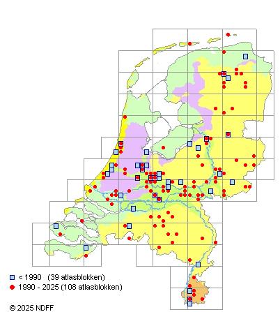 Het aantal atlasblokken (5x5 km) waarin de soort is gemeld binnen een periode van vijf jaar (vanaf 1980) of twintig jaar. Niet gecorrigeerd voor waarnemersinspanning en het aantal doorgegeven waarnemingen kan sterk variëren per periode, dus een trend in verspreiding kan hier niet direct uit worden afgelezen. Het opgegeven jaartal is het eerste jaar van de periode. Bron: gevalideerde waarnemingen uit de NDFF.