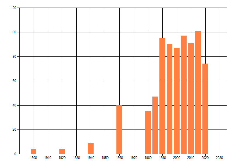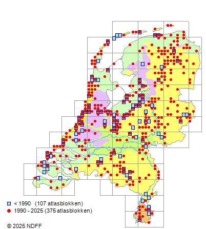 Het aantal atlasblokken (5x5 km) waarin de soort is gemeld binnen een periode van vijf jaar (vanaf 1980) of twintig jaar. Niet gecorrigeerd voor waarnemersinspanning en het aantal doorgegeven waarnemingen kan sterk variëren per periode, dus een trend in verspreiding kan hier niet direct uit worden afgelezen. Het opgegeven jaartal is het eerste jaar van de periode. Bron: gevalideerde waarnemingen uit de NDFF.