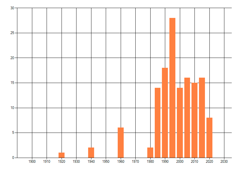 Het aantal atlasblokken (5x5 km) waarin de soort is gemeld binnen een periode van vijf jaar (vanaf 1980) of twintig jaar. Niet gecorrigeerd voor waarnemersinspanning en het aantal doorgegeven waarnemingen kan sterk variëren per periode, dus een trend in verspreiding kan hier niet direct uit worden afgelezen. Het opgegeven jaartal is het eerste jaar van de periode. Bron: gevalideerde waarnemingen uit de NDFF.