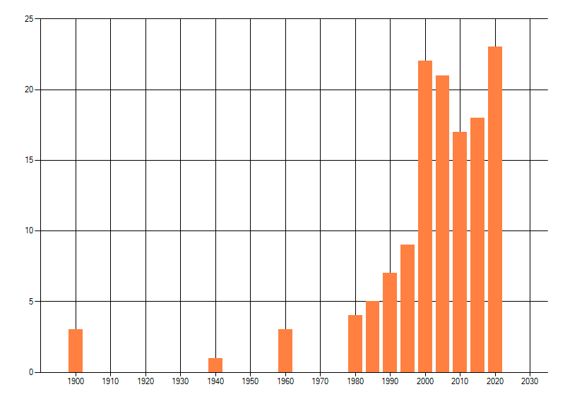 Het aantal atlasblokken (5x5 km) waarin de soort is gemeld binnen een periode van vijf jaar (vanaf 1980) of twintig jaar. Niet gecorrigeerd voor waarnemersinspanning en het aantal doorgegeven waarnemingen kan sterk variëren per periode, dus een trend in verspreiding kan hier niet direct uit worden afgelezen. Het opgegeven jaartal is het eerste jaar van de periode. Bron: gevalideerde waarnemingen uit de NDFF.