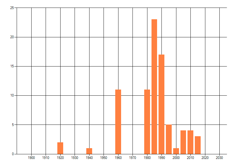Het aantal atlasblokken (5x5 km) waarin de soort is gemeld binnen een periode van vijf jaar (vanaf 1980) of twintig jaar. Niet gecorrigeerd voor waarnemersinspanning en het aantal doorgegeven waarnemingen kan sterk variëren per periode, dus een trend in verspreiding kan hier niet direct uit worden afgelezen. Het opgegeven jaartal is het eerste jaar van de periode. Bron: gevalideerde waarnemingen uit de NDFF.