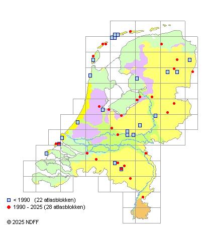 Het aantal atlasblokken (5x5 km) waarin de soort is gemeld binnen een periode van vijf jaar (vanaf 1980) of twintig jaar. Niet gecorrigeerd voor waarnemersinspanning en het aantal doorgegeven waarnemingen kan sterk variëren per periode, dus een trend in verspreiding kan hier niet direct uit worden afgelezen. Het opgegeven jaartal is het eerste jaar van de periode. Bron: gevalideerde waarnemingen uit de NDFF.