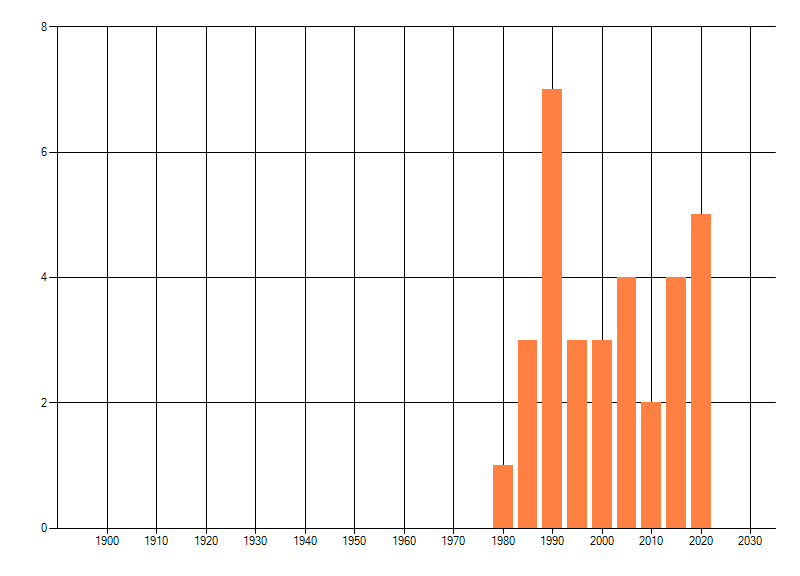 Het aantal atlasblokken (5x5 km) waarin de soort is gemeld binnen een periode van vijf jaar (vanaf 1980) of twintig jaar. Niet gecorrigeerd voor waarnemersinspanning en het aantal doorgegeven waarnemingen kan sterk variëren per periode, dus een trend in verspreiding kan hier niet direct uit worden afgelezen. Het opgegeven jaartal is het eerste jaar van de periode. Bron: gevalideerde waarnemingen uit de NDFF.