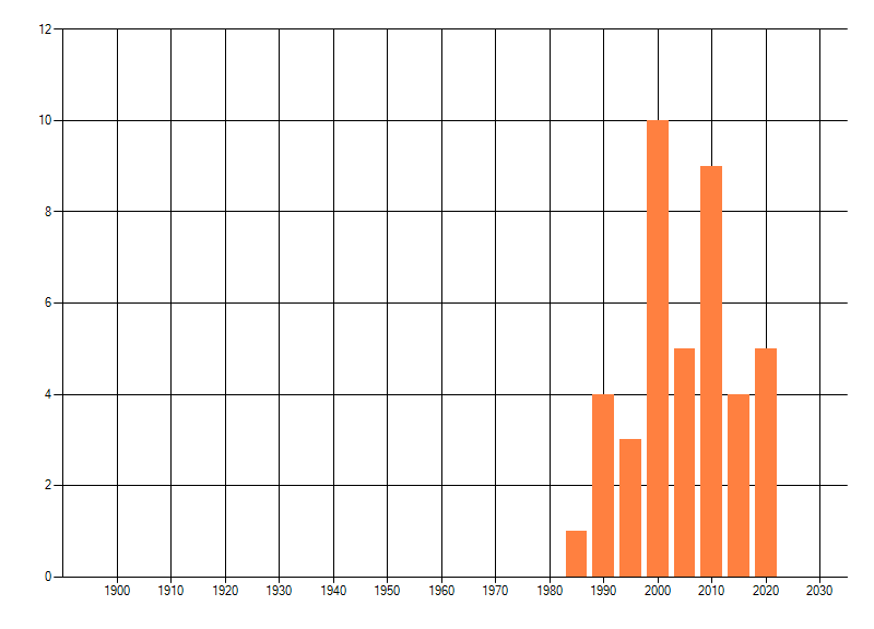 Het aantal atlasblokken (5x5 km) waarin de soort is gemeld binnen een periode van vijf jaar (vanaf 1980) of twintig jaar. Niet gecorrigeerd voor waarnemersinspanning en het aantal doorgegeven waarnemingen kan sterk variëren per periode, dus een trend in verspreiding kan hier niet direct uit worden afgelezen. Het opgegeven jaartal is het eerste jaar van de periode. Bron: gevalideerde waarnemingen uit de NDFF.