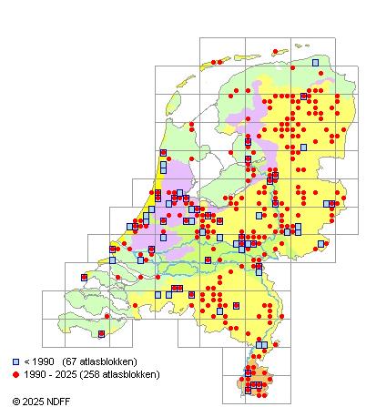 Het aantal atlasblokken (5x5 km) waarin de soort is gemeld binnen een periode van vijf jaar (vanaf 1980) of twintig jaar. Niet gecorrigeerd voor waarnemersinspanning en het aantal doorgegeven waarnemingen kan sterk variëren per periode, dus een trend in verspreiding kan hier niet direct uit worden afgelezen. Het opgegeven jaartal is het eerste jaar van de periode. Bron: gevalideerde waarnemingen uit de NDFF.