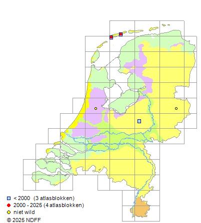 Het aantal atlasblokken (5x5 km) waarin de soort is gemeld binnen een periode van vijf jaar (vanaf 1980) of twintig jaar. Niet gecorrigeerd voor waarnemersinspanning en het aantal doorgegeven waarnemingen kan sterk variëren per periode, dus een trend in verspreiding kan hier niet direct uit worden afgelezen. Het opgegeven jaartal is het eerste jaar van de periode. Bron: gevalideerde waarnemingen uit de NDFF.