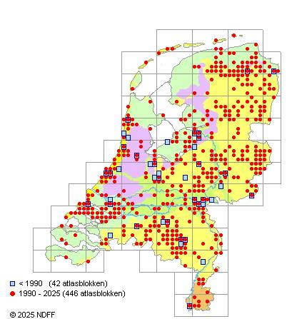 Het aantal atlasblokken (5x5 km) waarin de soort is gemeld binnen een periode van vijf jaar (vanaf 1980) of twintig jaar. Niet gecorrigeerd voor waarnemersinspanning en het aantal doorgegeven waarnemingen kan sterk variëren per periode, dus een trend in verspreiding kan hier niet direct uit worden afgelezen. Het opgegeven jaartal is het eerste jaar van de periode. Bron: gevalideerde waarnemingen uit de NDFF.