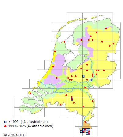 Het aantal atlasblokken (5x5 km) waarin de soort is gemeld binnen een periode van vijf jaar (vanaf 1980) of twintig jaar. Niet gecorrigeerd voor waarnemersinspanning en het aantal doorgegeven waarnemingen kan sterk variëren per periode, dus een trend in verspreiding kan hier niet direct uit worden afgelezen. Het opgegeven jaartal is het eerste jaar van de periode. Bron: gevalideerde waarnemingen uit de NDFF.