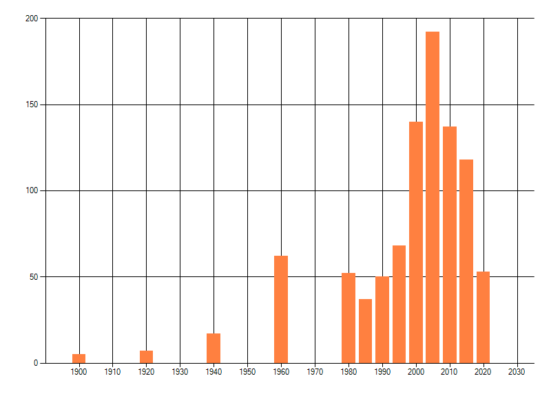 Het aantal atlasblokken (5x5 km) waarin de soort is gemeld binnen een periode van vijf jaar (vanaf 1980) of twintig jaar. Niet gecorrigeerd voor waarnemersinspanning en het aantal doorgegeven waarnemingen kan sterk variëren per periode, dus een trend in verspreiding kan hier niet direct uit worden afgelezen. Het opgegeven jaartal is het eerste jaar van de periode. Bron: gevalideerde waarnemingen uit de NDFF.