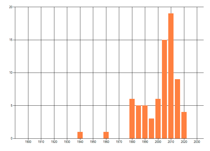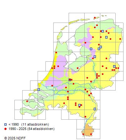 Het aantal atlasblokken (5x5 km) waarin de soort is gemeld binnen een periode van vijf jaar (vanaf 1980) of twintig jaar. Niet gecorrigeerd voor waarnemersinspanning en het aantal doorgegeven waarnemingen kan sterk variëren per periode, dus een trend in verspreiding kan hier niet direct uit worden afgelezen. Het opgegeven jaartal is het eerste jaar van de periode. Bron: gevalideerde waarnemingen uit de NDFF.