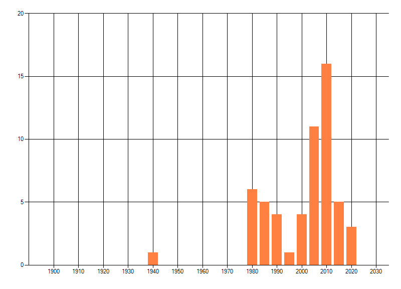 Het aantal atlasblokken (5x5 km) waarin de soort is gemeld binnen een periode van vijf jaar (vanaf 1980) of twintig jaar. Niet gecorrigeerd voor waarnemersinspanning en het aantal doorgegeven waarnemingen kan sterk variëren per periode, dus een trend in verspreiding kan hier niet direct uit worden afgelezen. Het opgegeven jaartal is het eerste jaar van de periode. Bron: gevalideerde waarnemingen uit de NDFF.