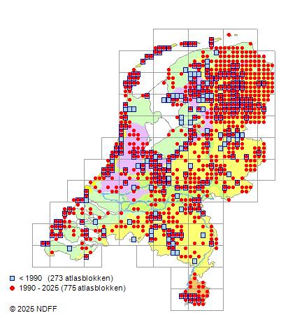 Het aantal atlasblokken (5x5 km) waarin de soort is gemeld binnen een periode van vijf jaar (vanaf 1980) of twintig jaar. Niet gecorrigeerd voor waarnemersinspanning en het aantal doorgegeven waarnemingen kan sterk variëren per periode, dus een trend in verspreiding kan hier niet direct uit worden afgelezen. Het opgegeven jaartal is het eerste jaar van de periode. Bron: gevalideerde waarnemingen uit de NDFF.