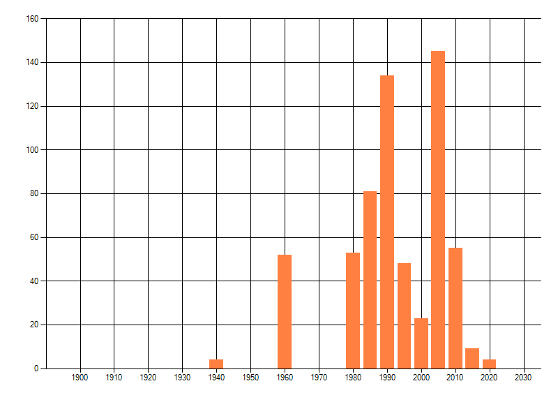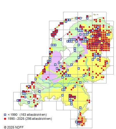 Het aantal atlasblokken (5x5 km) waarin de soort is gemeld binnen een periode van vijf jaar (vanaf 1980) of twintig jaar. Niet gecorrigeerd voor waarnemersinspanning en het aantal doorgegeven waarnemingen kan sterk variëren per periode, dus een trend in verspreiding kan hier niet direct uit worden afgelezen. Het opgegeven jaartal is het eerste jaar van de periode. Bron: gevalideerde waarnemingen uit de NDFF.