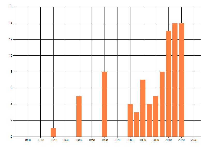 Het aantal atlasblokken (5x5 km) waarin de soort is gemeld binnen een periode van vijf jaar (vanaf 1980) of twintig jaar. Niet gecorrigeerd voor waarnemersinspanning en het aantal doorgegeven waarnemingen kan sterk variëren per periode, dus een trend in verspreiding kan hier niet direct uit worden afgelezen. Het opgegeven jaartal is het eerste jaar van de periode. Bron: gevalideerde waarnemingen uit de NDFF.