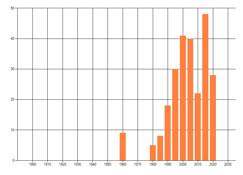 Het aantal atlasblokken (5x5 km) waarin de soort is gemeld binnen een periode van vijf jaar (vanaf 1980) of twintig jaar. Niet gecorrigeerd voor waarnemersinspanning en het aantal doorgegeven waarnemingen kan sterk variëren per periode, dus een trend in verspreiding kan hier niet direct uit worden afgelezen. Het opgegeven jaartal is het eerste jaar van de periode. Bron: gevalideerde waarnemingen uit de NDFF.