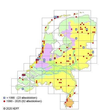Het aantal atlasblokken (5x5 km) waarin de soort is gemeld binnen een periode van vijf jaar (vanaf 1980) of twintig jaar. Niet gecorrigeerd voor waarnemersinspanning en het aantal doorgegeven waarnemingen kan sterk variëren per periode, dus een trend in verspreiding kan hier niet direct uit worden afgelezen. Het opgegeven jaartal is het eerste jaar van de periode. Bron: gevalideerde waarnemingen uit de NDFF.
