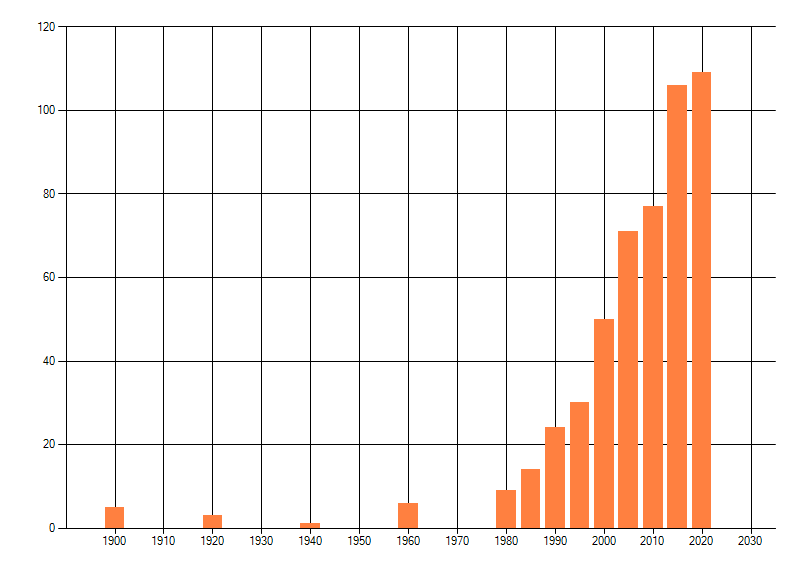 Het aantal atlasblokken (5x5 km) waarin de soort is gemeld binnen een periode van vijf jaar (vanaf 1980) of twintig jaar. Niet gecorrigeerd voor waarnemersinspanning en het aantal doorgegeven waarnemingen kan sterk variëren per periode, dus een trend in verspreiding kan hier niet direct uit worden afgelezen. Het opgegeven jaartal is het eerste jaar van de periode. Bron: gevalideerde waarnemingen uit de NDFF.